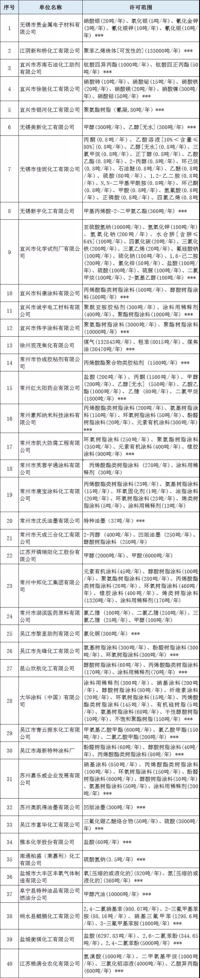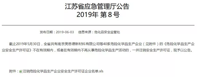 6月3日,江苏省应急管理厅发布公告称:截止2019年5月30日,全省共有南京美思德新材料有限公司等40家危险化学品生产企业(见附件)的《危险化学品生产企业安全生产许可证》不在有效期内,或者在有效期内不再从事危险化学品生产活动的,一并注销安全生产许可证,现予以公告。